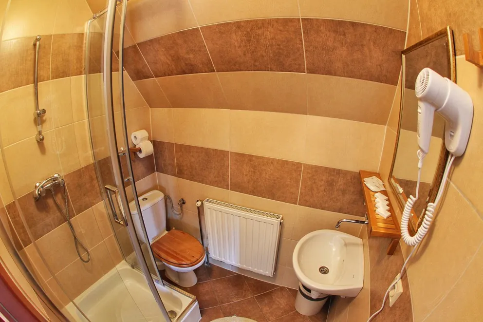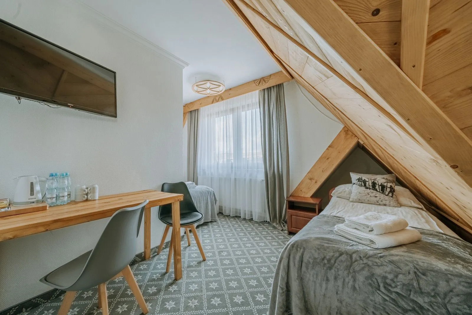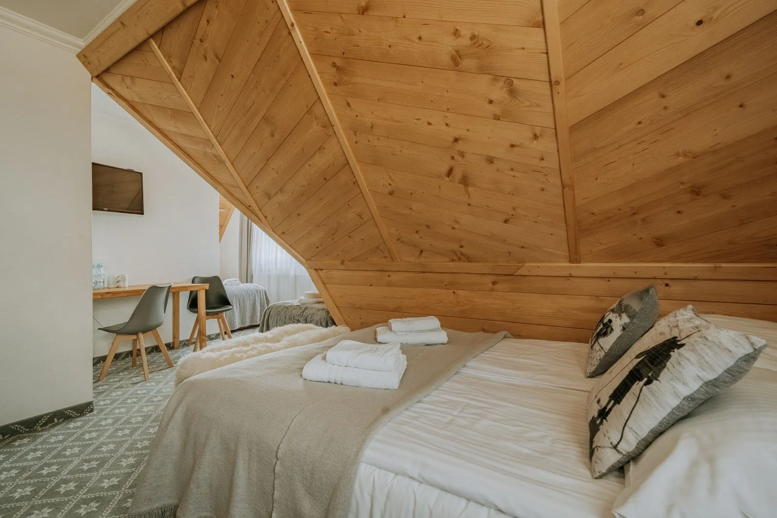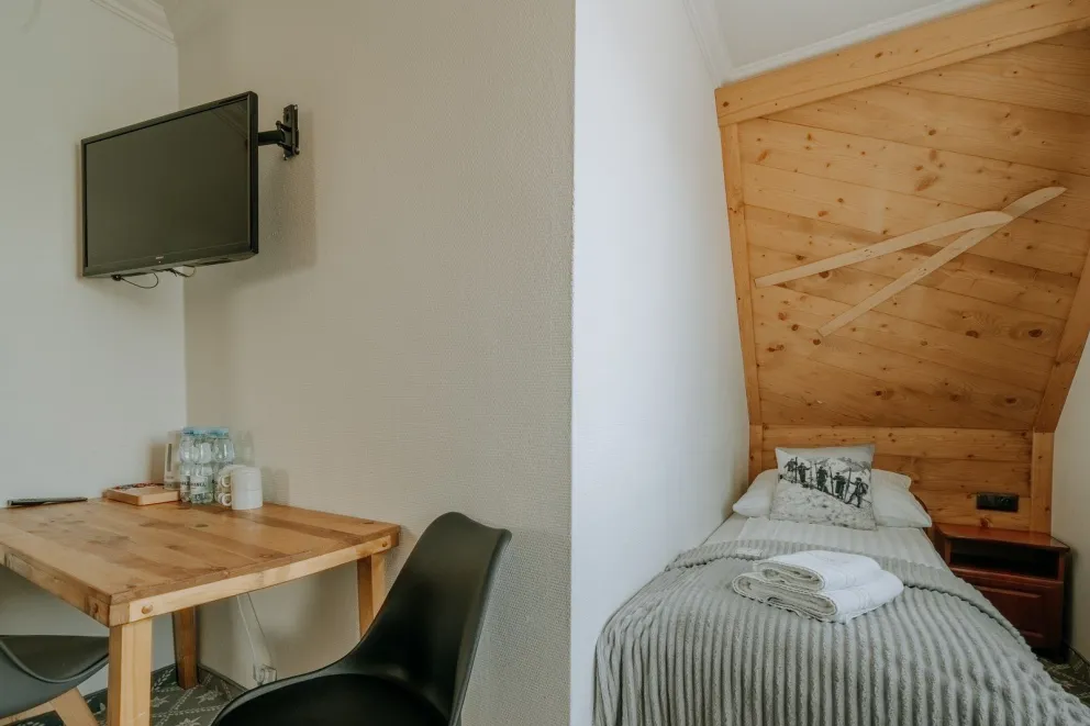 Przytulny pokój 4 osobowy z podwójnym łóżkiem i dwoma pojedyńczymi łóżkami lub drugi z czterema pojedyńczymi łóżkami, które można łączyć. Pokój ma szafę, stolik, fotele, szafki nocne, czajnik bezprzewodowy, kubeczki, tv i dostęp do wifi. Pokój ma własną łazienkę z przysznicem, toaletą, umywalką i suszarką do włosów. Bez balkonu. 3 piętro. Udostępniamy bezpłatne miejsce parkingowe dla tego pokoju.